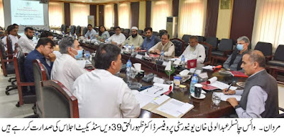 عبدالولی خان یونیورسٹی مردان کی 39ویں سینڈیکیٹ کا اجلاس وائس چانسلر پروفیسر ڈاکٹر ظہور الحق کی زیر صدارت منعقد ہوا اجلاس میں 43ویں سلیکشن بورڈ اجلاس کی سفارشات کو منظور کیا گیا جس میں کیمسٹری ، ایگریکلچر ، میتھس اور بائیو کمیسٹری شعبہ جات کے لئے پانچ پروفیسرز کی تعیناتی کی منظوری دی گئی جبکہ ،زراعت ،کیمسٹری،ماحولیاتی سائنس،انگلش ،ہیلتھ اینڈ فزیکل ایجوکیشن،آئی آر ، آرکیالوجی،ٹورازم،معاشیات میں 16 اسٹنٹ پروفیسرز کی تعیناتی کی منظوری دی گئی اس کے علاوہ مختلف امور پر مشاورت کی گئی اور سنڈیکیٹ ممبران کو آگاہ کیا جس پر سنڈیکیٹ ممبران نے اطمینان کا اظہار کیا 38ویں سینڈیکیٹ اجلاس کے منٹس کو بھی منظور کیا گیا وائس چانسلر پروفیسر ڈاکٹر ظہور الحق نے سنڈیکیٹ کے تمام ممبران جو کہ پشاور اور اسلام آباد سے تشریف لائے ہیں ان کا خصوصی شکریہ ادا کرتے ہوئے کہا کہ آج کہ اس اجلاس سے یونیورسٹی کی تدریسی تعلیمی تحقیقی اور تخلیقی امور میں بہتری آئے گی اور ان ممبران کے تعاون اور رہنمائی اور مثبت سوچ کی بدولت آج کی سینڈکٹ اجلاس کی کاروائی مثبت انداز میں پایہ تکمیل کو پہنچی اور تمام ایجنڈا ایٹم احسن طریقے سے مکمل ہوئے وائس چانسلر نے سنڈیکیٹ کے ممبران کا یونیورسٹی کے تعلیمی، تحقیقی، تخلیقی اور انتظامی امور میں گہری دلچسپی ظاہر کرنے پر ان کا شکریہ ادا کرتے ہوئے کہا کہ ان کی رہنمائی، تجربے اور صلاحیتوں کی بدولت سنڈیکیٹ میں اہم، مثبت اور تعمیری نوعیت کے فیصلے کئے گئے جن کی بدولت عبدالولی خان یونیورسٹی مردان یونیورسٹی کے انتظامی، تدریسی اور دیگر امور میں بہتری آئے گی۔ انہوں نے مزید کہا کہ یونیورسٹی میں زیر تعلیم 14000 سے زائد طلباء و طالبات اور ریسرچرز کو معیاری تعلیمی و تحقیقی سرگرمیاں فراہم کرنا اولین مقصد ہے کیونکہ صوبے کے دور دراز علاقوں سے تعلق رکھنے والے ریسرچرز یہاں زیر تعلیم ہیں۔ان کے وقت کو قیمتی اور بامقصد بنانے کے لئے یونیورسٹی کے اساتذہ اور افسران نے اپنا کردار ادا کرنا ہے۔اجلاس میں شرکت کرنے والے سنڈیکیٹ کے ممبران میں سنڈیکیٹ کے اجلاس میں ،سبابق وی سی انجینئرنگ یونیورسٹی پشاور امتیاز گیلانی نمائندہHEC , ڈی جی پیمرہ اسلام آباد مختار احمد ، جاوید اقبال ایڈیشنل سیکرٹری HED ڈپٹی سیکرٹری فنانس عدنان خٹک ڈپٹی سیکرٹری اسٹیبلشمنٹ حبیب الحسن گیلانی , رئیس خان پرنسپل گورنمنٹ کالج اکبرپورہ نوشہرہ, روزینہ رحیم پرنسپل گورنمنٹ گرلز ڈگری کالج نوشہرہ،،پروفیسر ڈاکٹر سعید الاسلام,پروفیسر ڈاکٹر شیر افضل،پروفیسر ڈاکٹر سلطان آیاز، پروفیسر ڈاکٹر محمد طاہر ،رجسٹرار صائم سہیل ,ڈپٹی رجسٹرار حسن خان, ڈائریکٹر فنانس ڈاکٹر شائستہ ارشاد ، ,ڈاکٹر حاضر رحمن،ڈاکٹر یاسر شاہ،عبدالصمد خان،سہیل عالم خان، اور دیگر