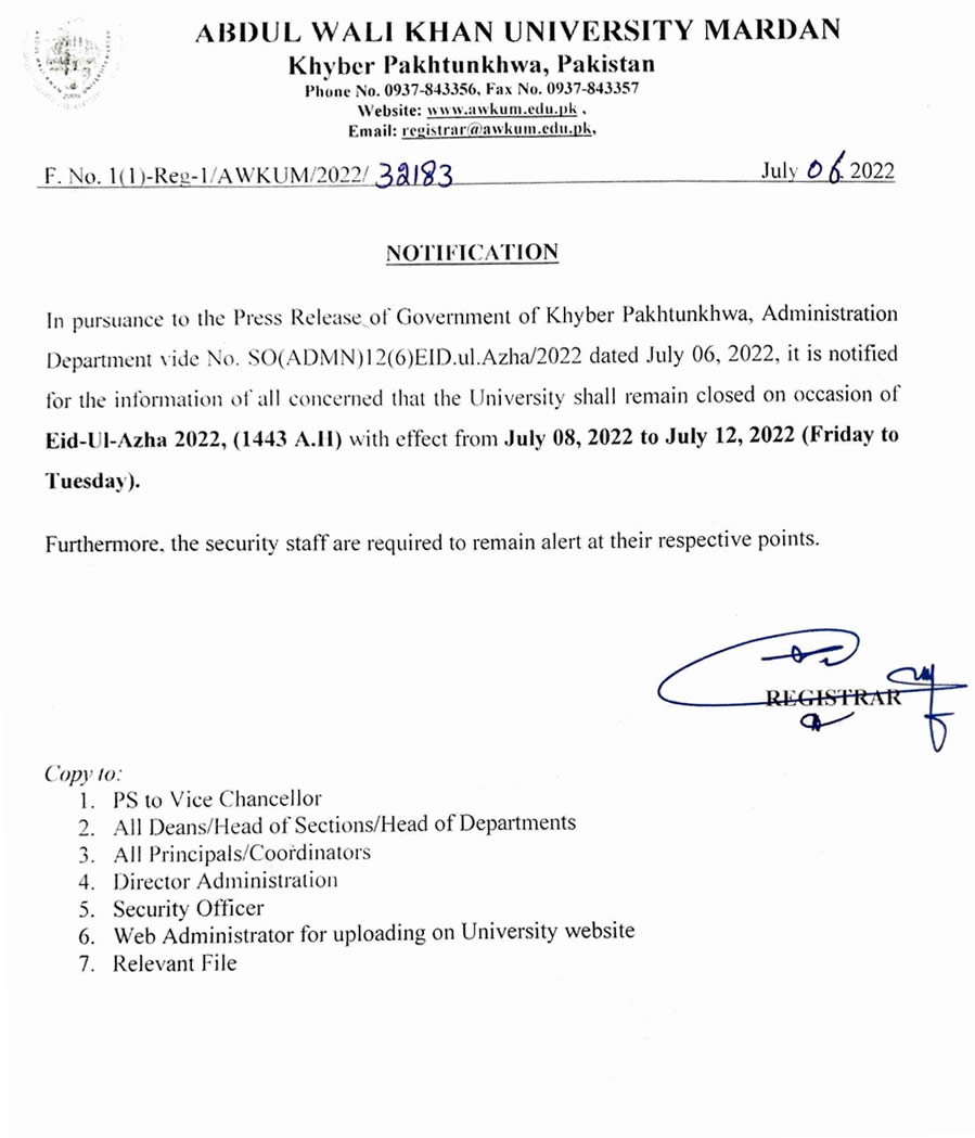Notification From Office of The Registrar Regarding "Eid-Ul-Azha 2022, (1443 A.H)"