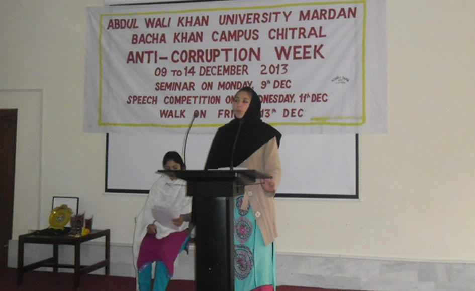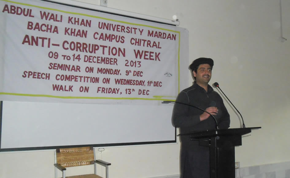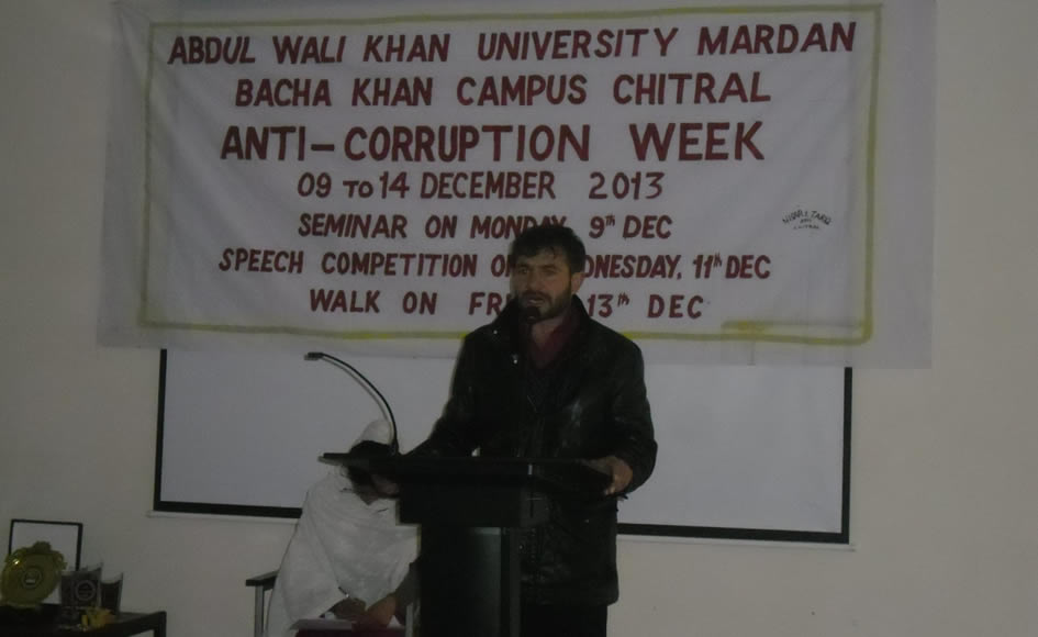Bacha Khan Campus Chitral organized different activities in observance of the Anti-Corruption Week held from 9th to 14th December 2013. The campus also organized a speech competition among students which was held on Wednesday Dec 11, 2013. Students spoke enthusiastically about the deep roots of corruption in Urdu as well as English. Shields, medals and certificates were awarded to the position holders as well as participants. Students committed themselves strongly to be part of the anti-corruption campaign and promised to keep up their strong input to raise awareness in future. At the end Coordinator, Mr. Shehzad Khan appreciated the participants & organizers for organizing such informative & contributive activities in the university.