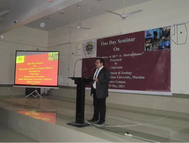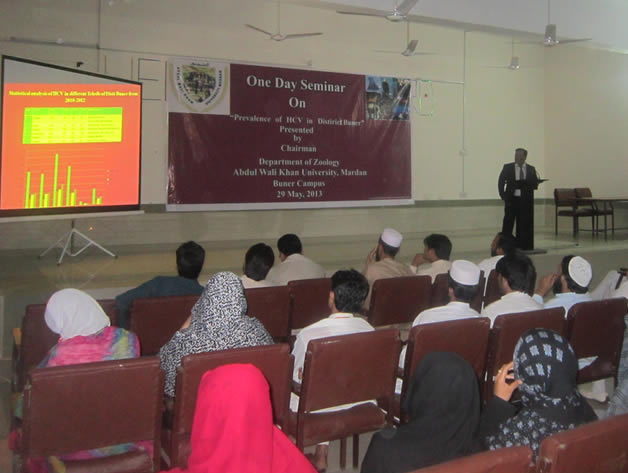 One Day Seminar on the topic ”Prevalence of HCV in Buner” was arranged by Department of Zoology, Buner Campus, Abdul Wali Khan University Mardan on 29 May, 2013 which was Presented by Shahroz Khan Chairman Department of Zoology.