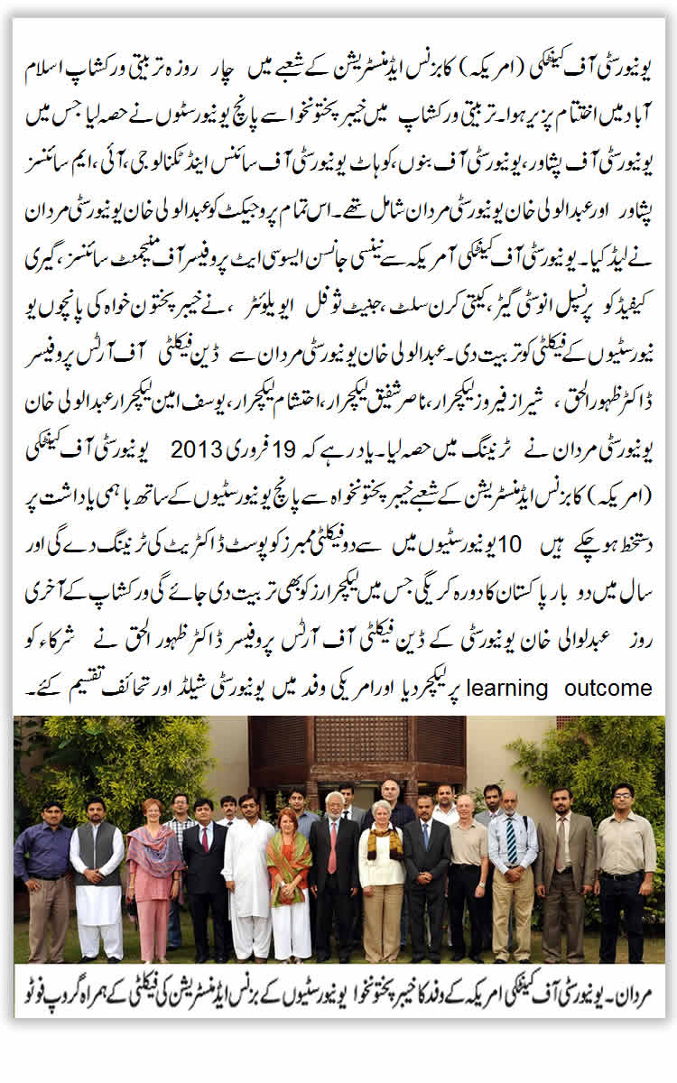 A "four-days"workshop of Kentucky University America in the field of Business Administration, ended in Islamabad the other day. Five Universities of Khyber Pakhtunkhwa participated in the training including; University of Peshawar, University of Bannu, Kohat University, IM Sciences Peshawar and Abdul Wali Khan University Mardan.