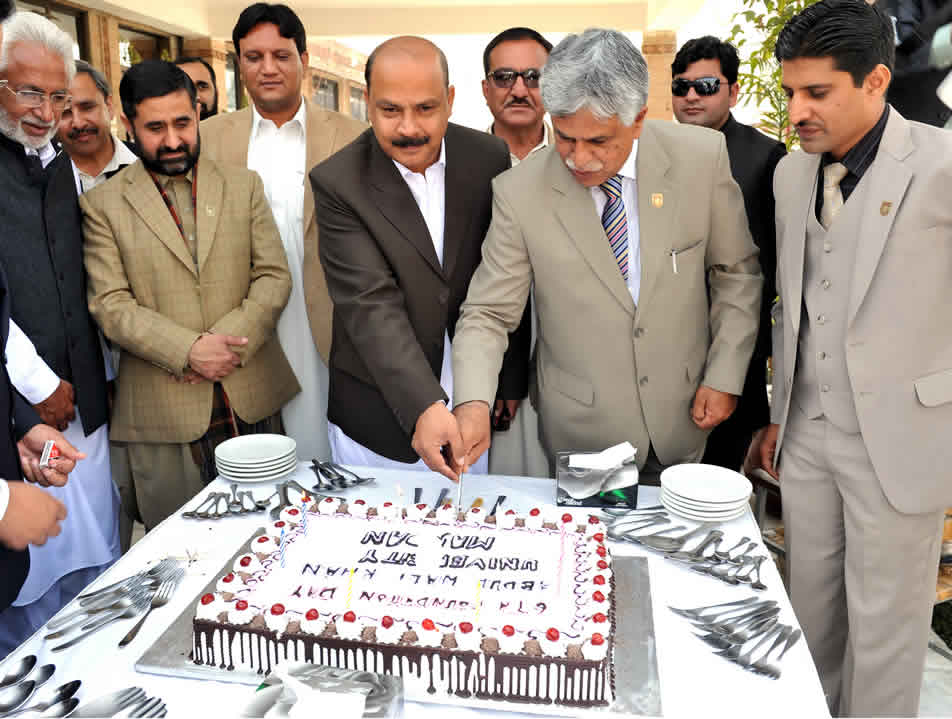 In the end, the Director International Leicester University, Mr. Shahid Hussain, presented a souvenir of University of Leicester, UK to Prof. Dr. Ihsan Ali.A grand function, in honor of the celebration of Abdul Wali Khan University’s five years completion held place at the Main Campus in which Vice Chancellor, Prof. Dr. Ihsan Ali hoisted the national as well as AWKUM flag. A great number of students, faculty and staff members were present in the ceremony. Prof. Dr. Ihsan Ali along with member provincial assembly, Mr. Zahid Durrani cut the cake to grace the 6th Foundation Day ceremony of AWKUM. The Director International Leicester University UK, Mr. Shahid Hussain was also present on the occasion.