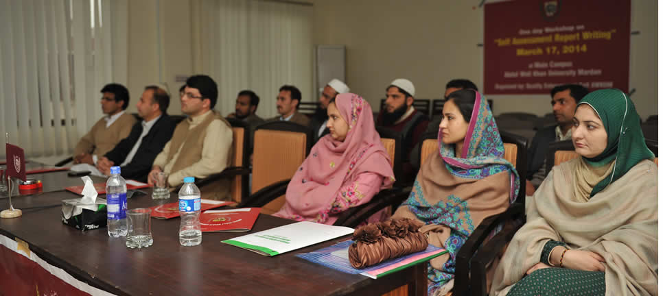 A one day workshop on “Self Assessment Report Writing” was held on March 17, 2014 at the Main Campus, Abdul Wali Khan University, Mardan. PT members from Department of Management Sciences, Department of Tourism & Hospitality Management, Department of English, Department of Islamic Studies and Department of Zoology of Abdul Wali Khan University, Mardan attended the workshop.