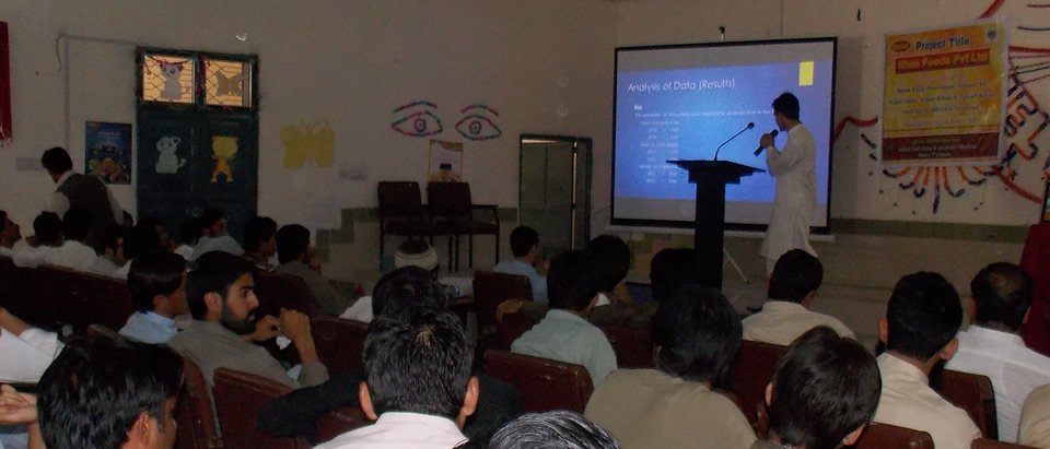 Project Seminar was on the topics "AWKUM, SHAAN FOODS, BUNER MARBLES & UFONE. The projects were produced & directed by Mr. Syed Bahar Ali, lecturer & supervisor, Department of Management Science Department.