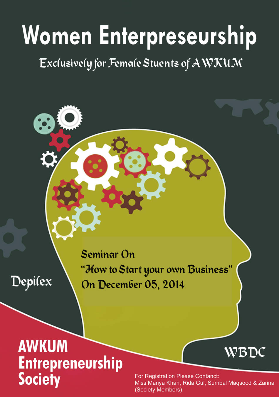 Registrations are open for a One Day Seminar on Women Entrepreneurship “How to start your own business” organized by Entrepreneurship Society, Department of Management Sciences, Abdul Wali Khan University Mardan in collaboration with Women Business Development Center (WBDC). The Seminar is sponsored by Depilex Mardan. The Seminar is open for all the female students of AWKUM.