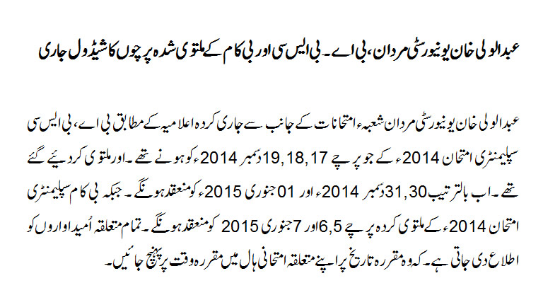 ABDUL WALI KHAN UNIVERSITY MARDAN B.A / B.Sc / B.Com Supplementary Exam Re-scheduled