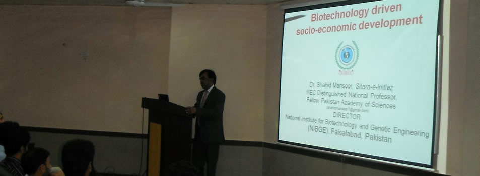 Professor Dr. Shahid Mansoor delivered a seminar on “Biotechnology in Socio-Economic Development” in the conference room, ground floor, Academic Block 2B, to the faculty members and students of Departments of Biotechnology, Botany, Biochemistry and Environmental Sciences. He discussed about the challenges faced by the country in Agriculture, Health, Energy, Environment and Education sectors and the opportunities in Biotechnology to contribute in meeting these challenges. During his talk, the Director shared the achievements and contributions of NIBGE in Agriculture, Health, Energy, Environment and Education sectors through Biotechnology research.