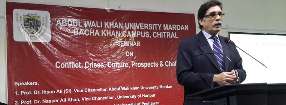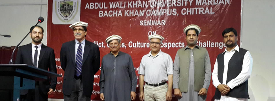 A seminar on the topic Conflict, Crises, Culture: Prospects & Challenges was held at Abdul Wali Khan University Mardan, Bacha Khan Campus Chitral on May 05, 2015. Speakers delivered their talk on their respective topic within the umbrella of the mentioned topic for the seminar. Prof. Dr. Nasser Ali Khan, Vice Chancellor Haripur University, Prof. Dr. Nasir Jamal Khattak, Chairman Department of English, Peshawar University and Prof. Dr. Shah Jehan Syed, Chairman (Ex) Department of Journalism & Mass Communication, Peshawar University were the keynote speakers for the seminar.