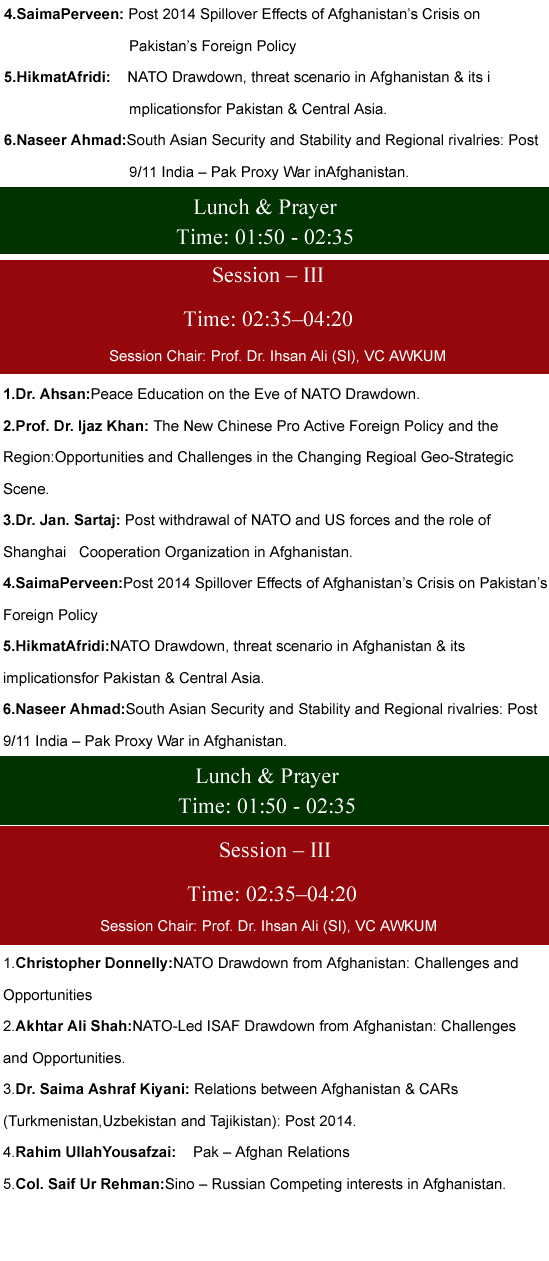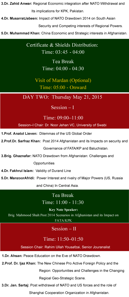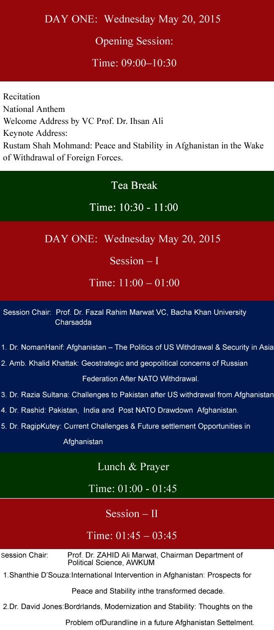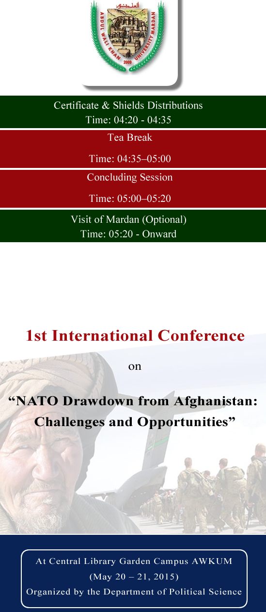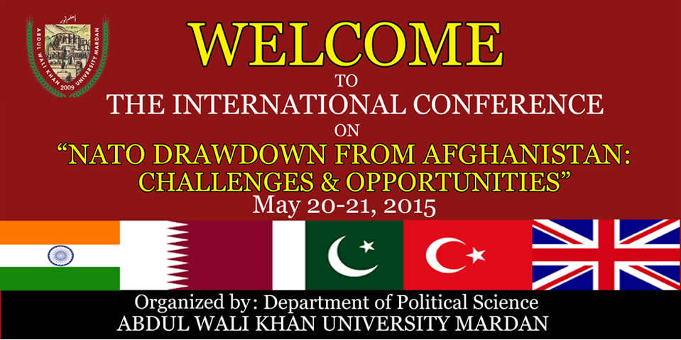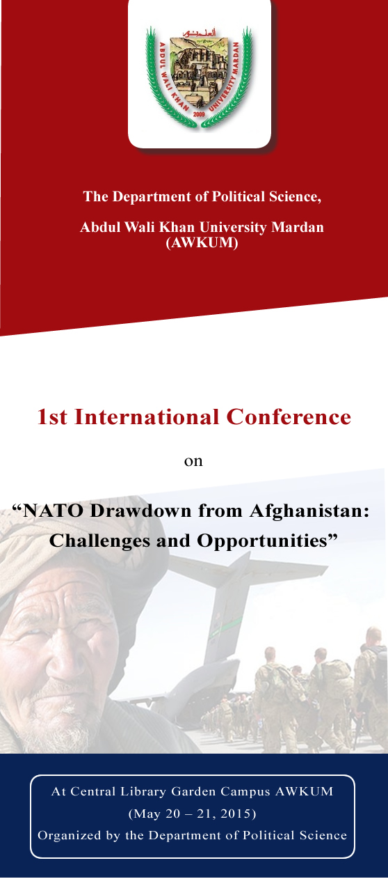 The International Conference, Abdul Wali Khan University Mardan, will be held from May 20, 2015 at AWKUM. The Conference has been organized by the Department of Political Science. The Conference would focus on NATO Drawdown from Afghanistan , Challenges and opportunities.
