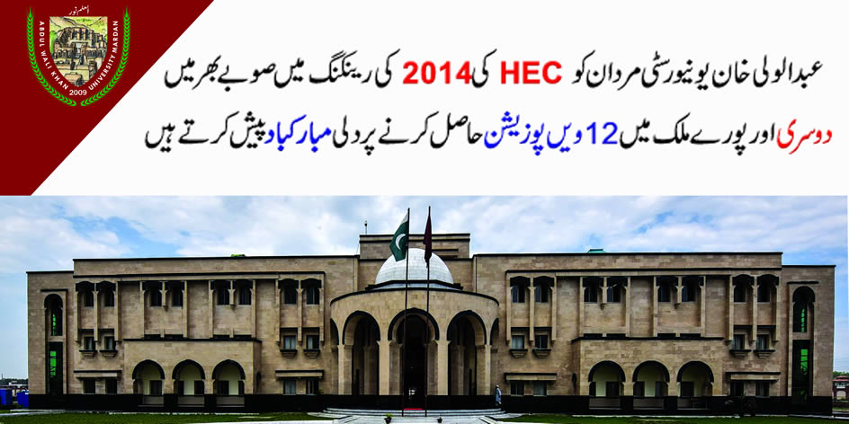 Chairman, Higher Education Commission Islamabad, Dr. Mukhtar Ahmad announced the University Rankings for the year 2014 according to which Abdul Wali Khan University Mardan is ranked 12th in Pakistan and 2nd in Khyber Pakhtunkhwa.