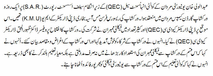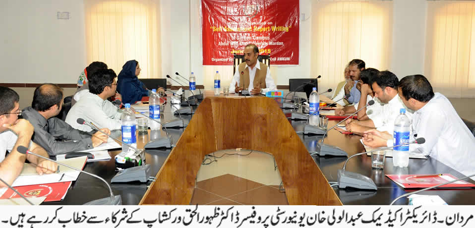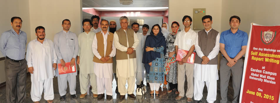 A one day workshop on "Self Assessment Report Writing" was organized on June 08, 2015 at Garden Campus, Abdul Wali Khan University, Mardan. PT members from the Departments of Agriculture, Bio-technology, Economics, Political Science and LAW (AWKUM), attended the workshop.