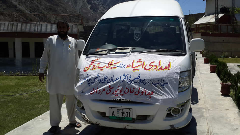 Chitral (Media Incharge Mr.Farid Ahmad BKCC) August 4, 2015 . Since july 16th 2015 Chitral became a victim of floods. Every day and night is bringing destruction for each and every village of chitral. All the roads and bridges are washed away by the floods, many of the villages are cutoff from Chitral town. Hundreds of houses, shops, mosques and other building ware destroyed. People are forced to live in open area. In this critical situation Abdul Wali Khan University Chitral Campus on the instruction of Vice Chancellor Prof. Dr. Ihsan Ali is helping out the flood victims.
