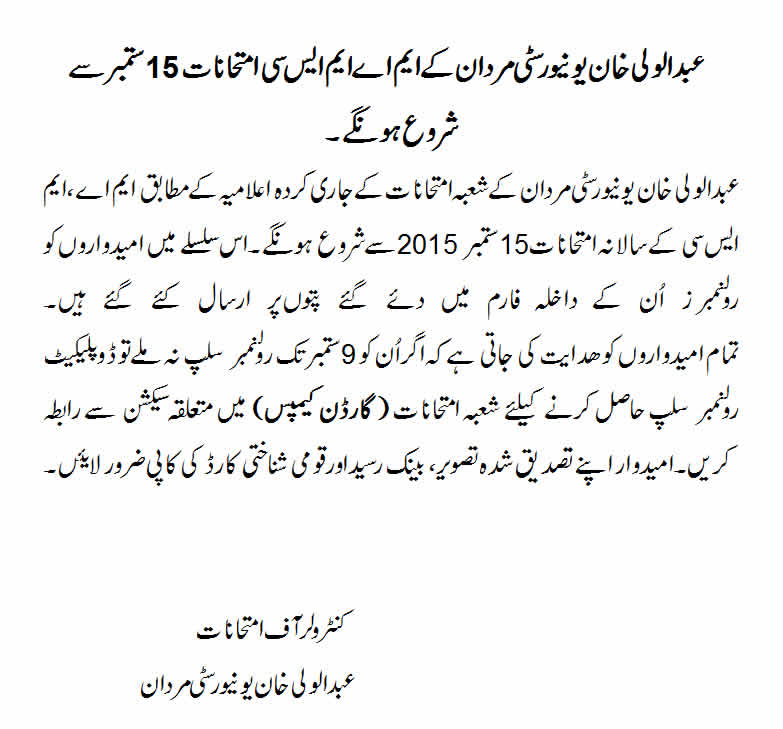 It is hereby notified for the general information of all concerned that M.A / M.Sc (Annual) Examination 2015 of the Abdul Wali Khan University Mardan will commence from Tuesday, September 15, 2015.