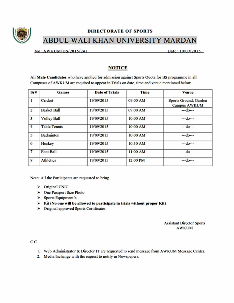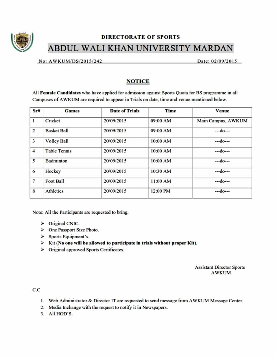 ABDUL WALI KHAN UNIVERSITY MARDAN Sports Trials for Admission in BS Program 2015