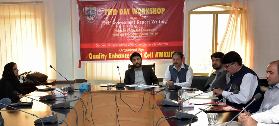 A Two Day workshop on "Self Assessment Report Writing" was organized on October 29-30, 2015 at Garden Campus, Abdul Wali Khan University, Mardan. PT members from various departments attended workshop.