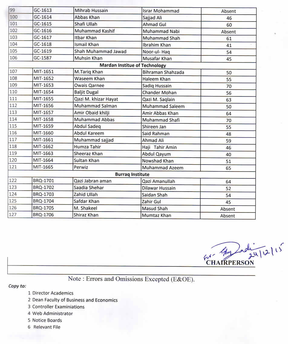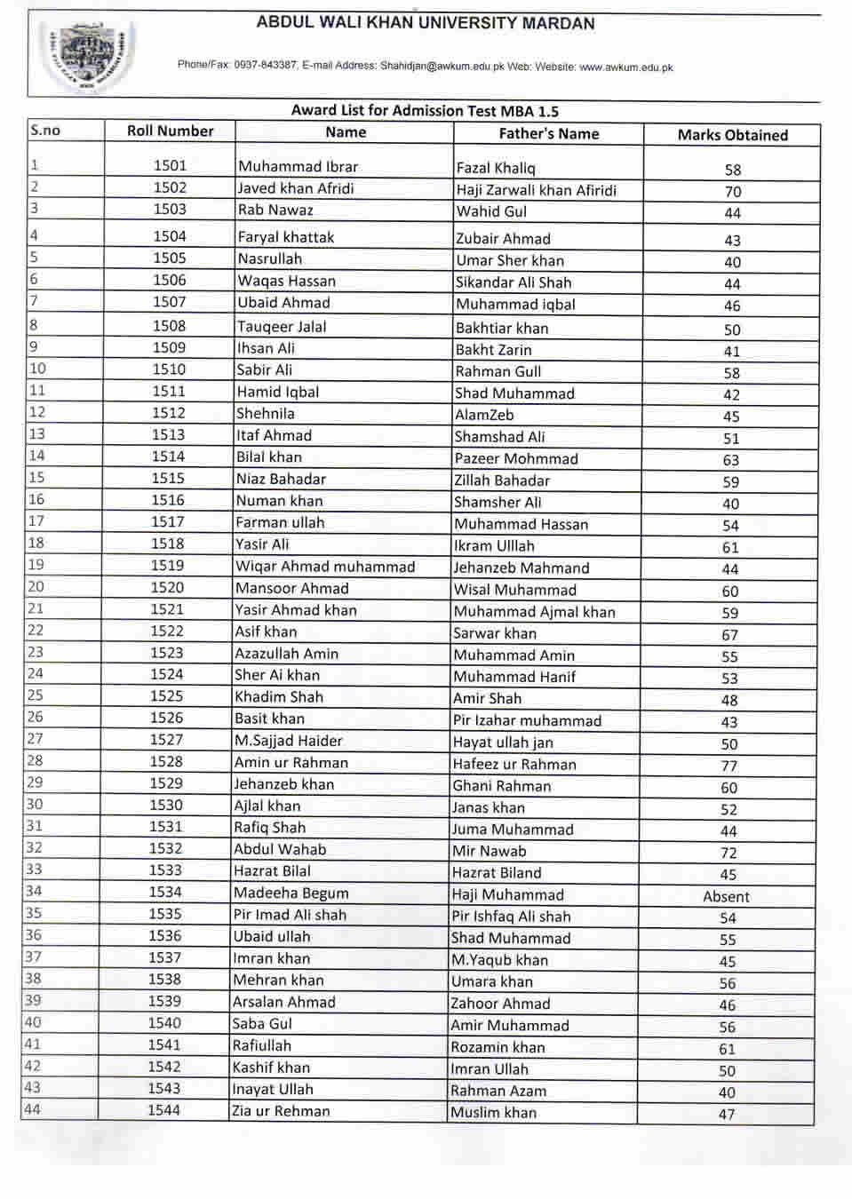 Entry Test Result for MBA (1.5)