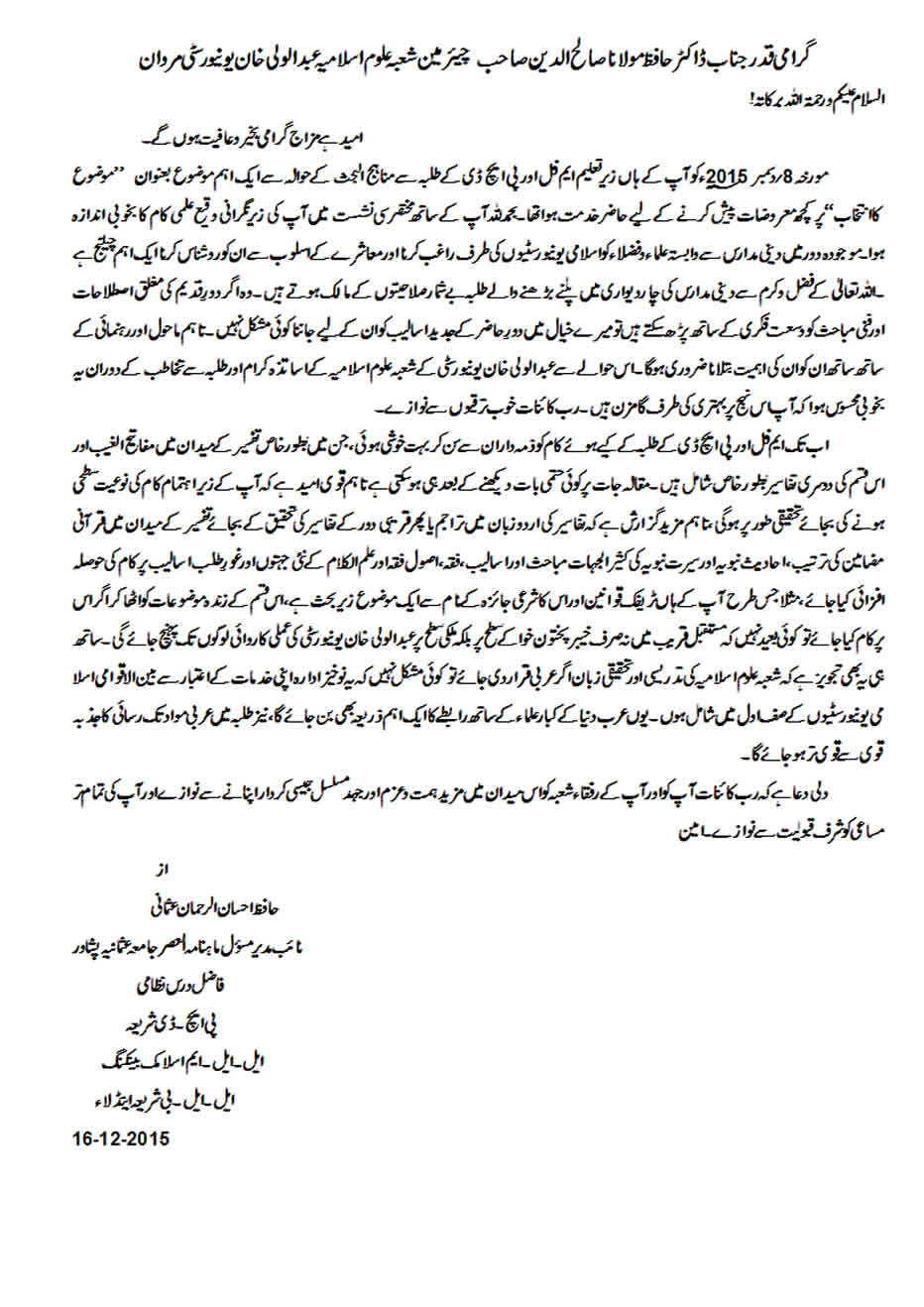 Letter of Appreciation from Dr. Ihsanurrahman, Vice Editor the Monthly Al-Asar Jamia Usmania Peshawar