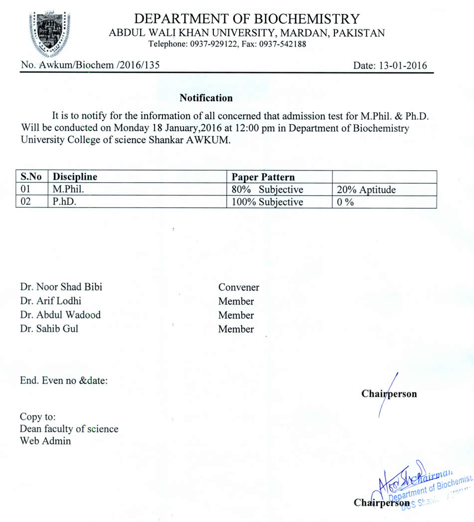Notification Regarding "Admission Test for MPhil Phd in Biochemistry"
