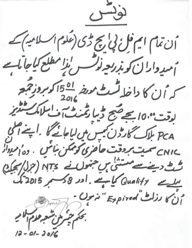 Notification Regarding "Admission Test for MPhil Phd in Islamic Studies"