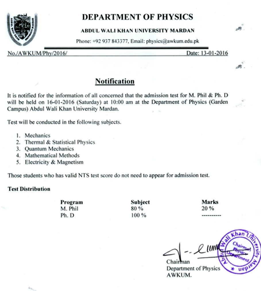 Notification Regarding "Admission Test for MPhil Phd in Physics"