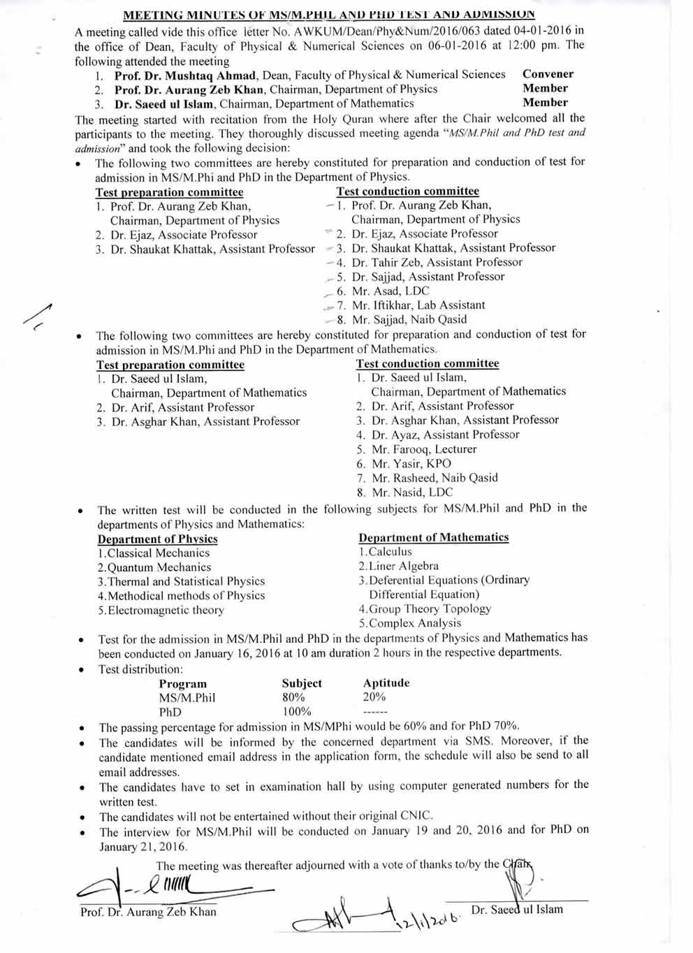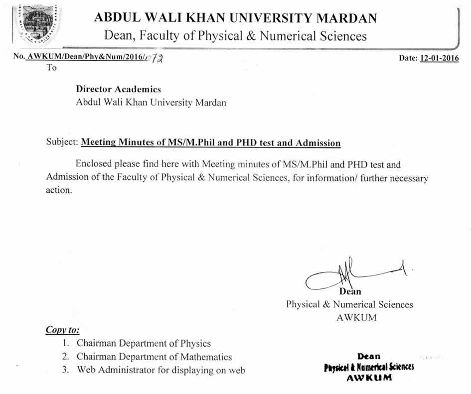 Meeting Minutes of MS, MPhil and PhD Test and Admission