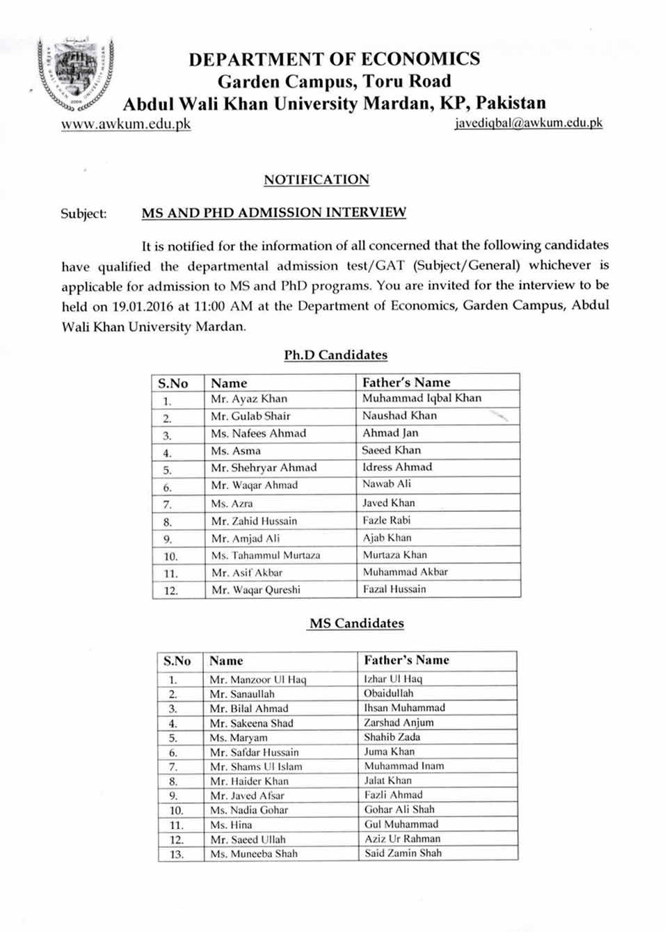 Notification Regarding "Admission Interview for MS PhD in Economics"