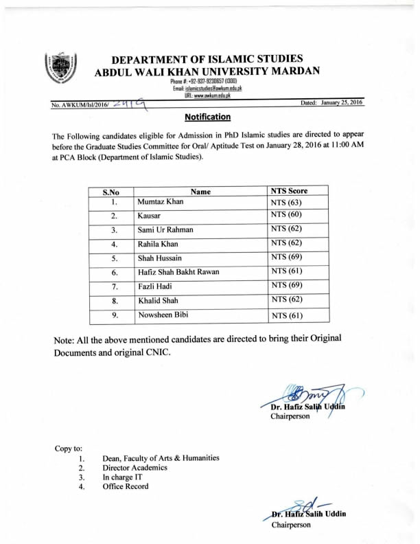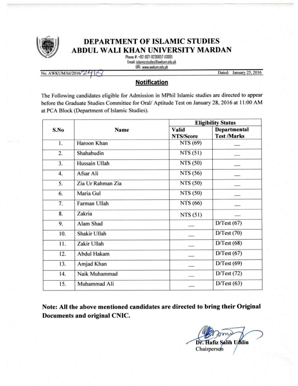 Notification Regarding "Admission Interview for MPhil Islamic Studies"