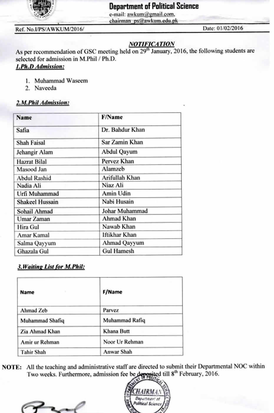 Recommended Candidates for PhD & M.Phil Admission in Political Science