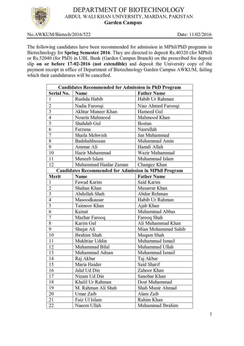 Recommended Candidates for M.Phil/PhD Admission in Biotechnology