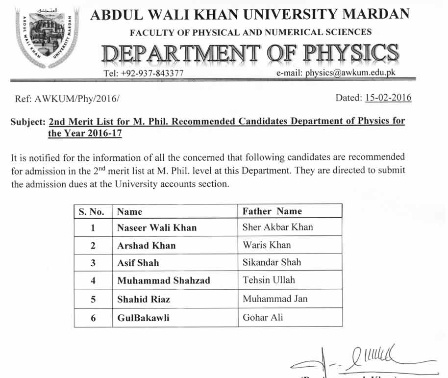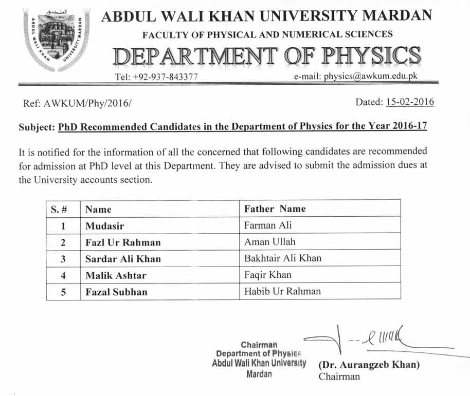 Recommended Candidates for M.Phil/PhD Admission in Physics