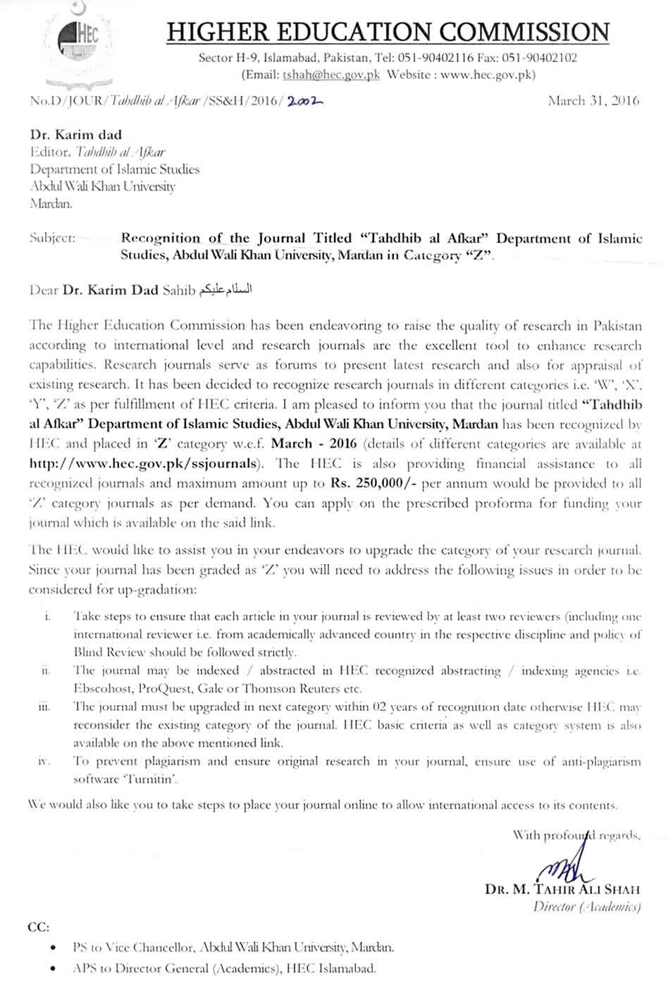 Recognition of Journal Titled "Tahdhib al Afkar" Department of Islamic Studies, AWKUM in Category "Z"