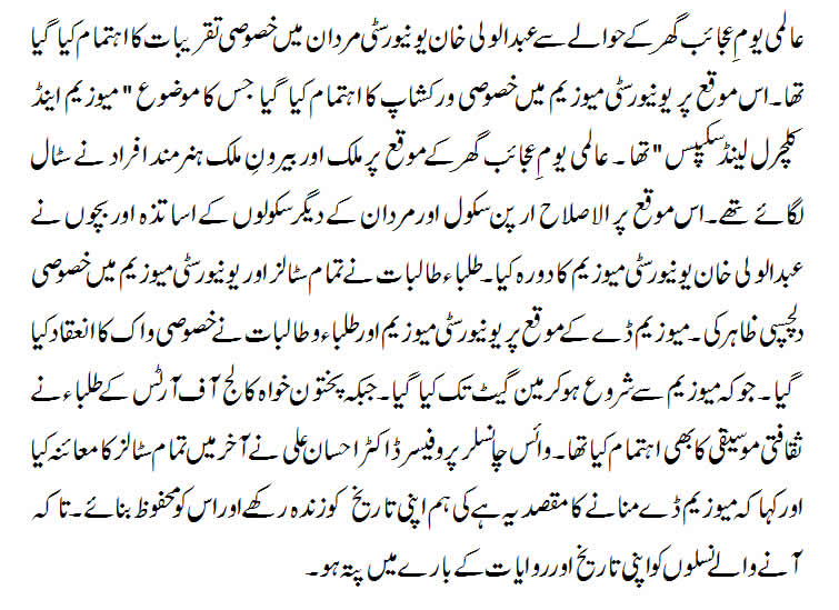 The International Museum Day was observed on 18th May 2016 in University Museum, Abdul Wali Khan University Mardan. Since 1977, the 18th of May is marked as International Museum Day trough out the world each year.