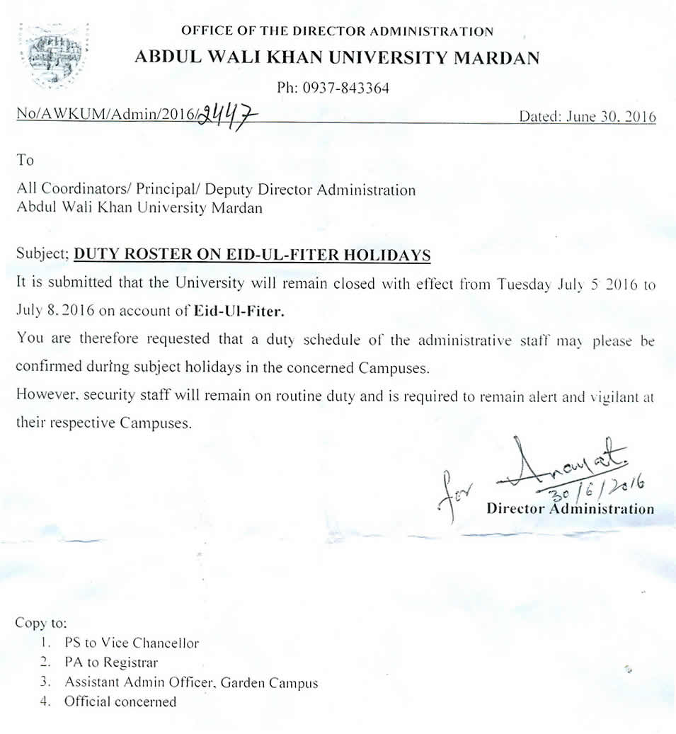 Duty Roster on Eid-ul-Fiter Holidays