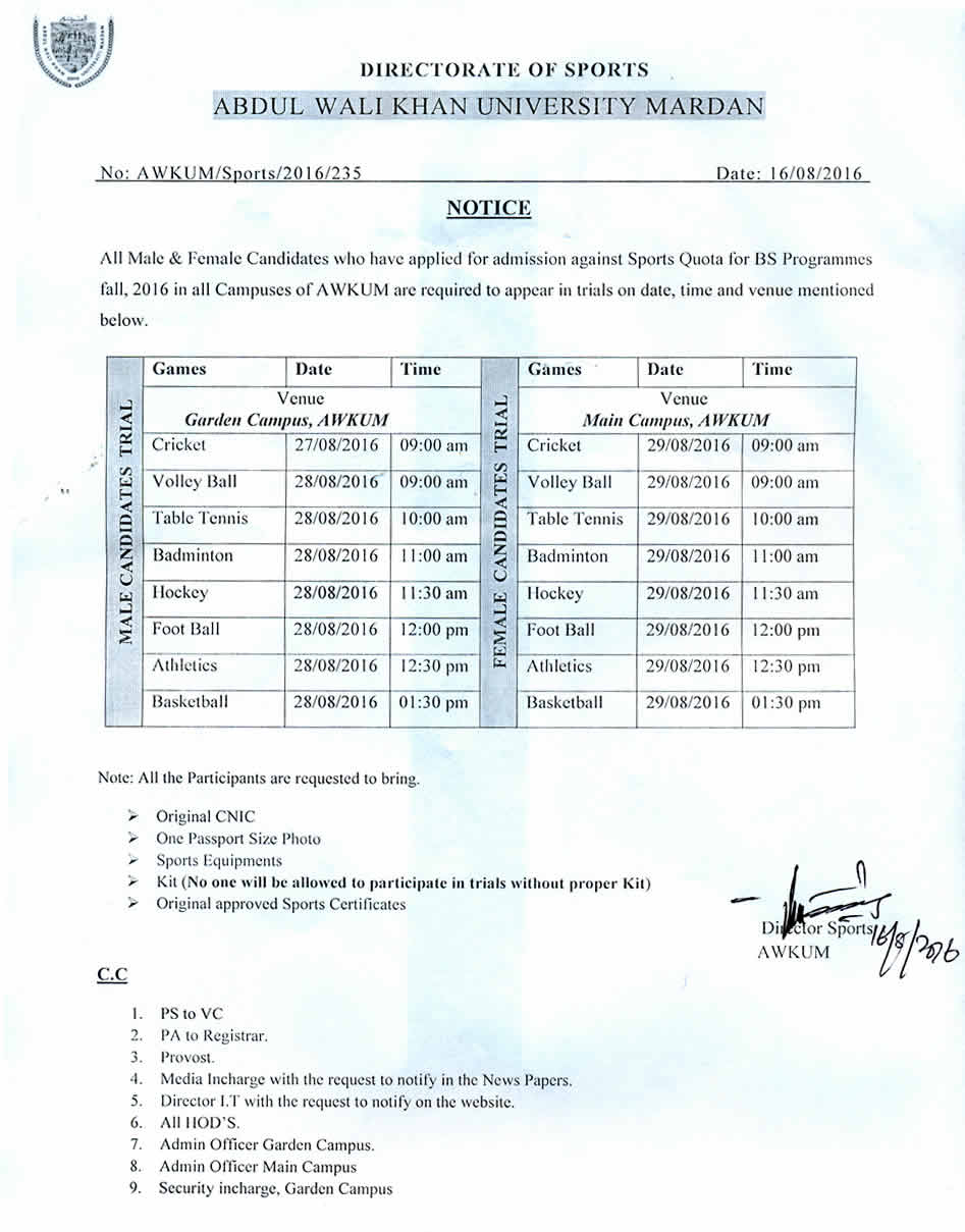 Sports Trials for Admission Against Sports Quota in BS Programmes