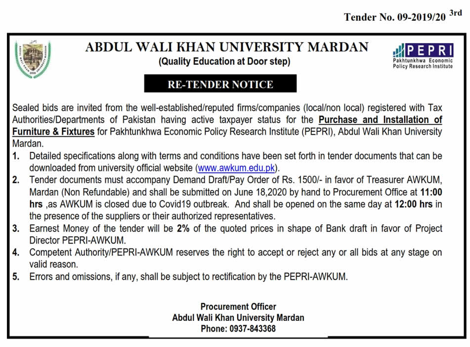 RE-Tender Notice For The Purchase and Installation of Furniture and fixture for PEPRI