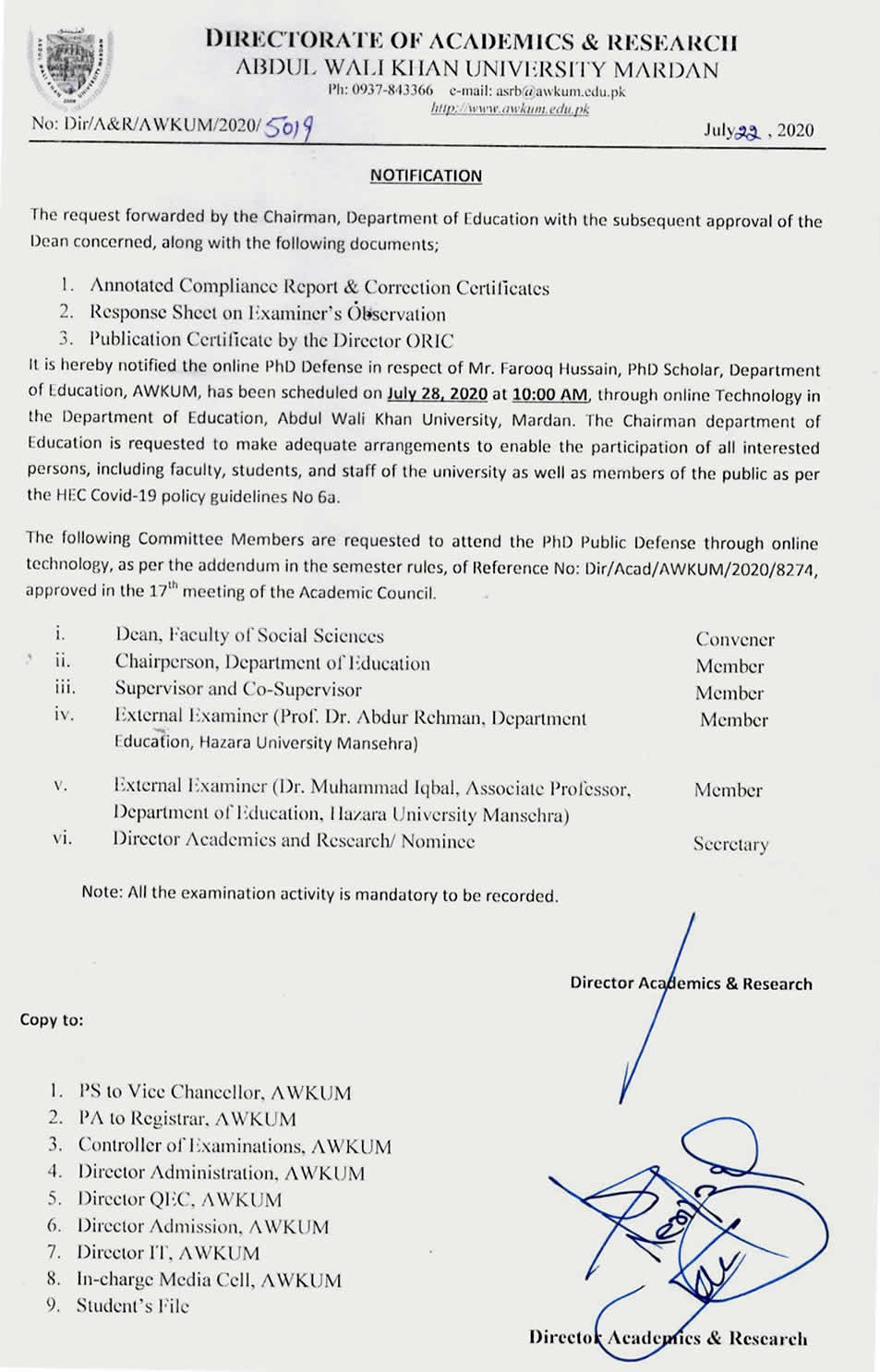 Online Defense of Mr. Farooq Hussain, PhD Scholar Education, Department of Education, AWKUM