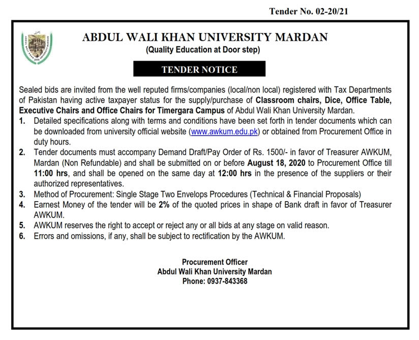Tender Notice regarding supply/purchase of Classroom chairs, Dice, Office Table, Executive Chairs and Office Chairs for Timergara Campus