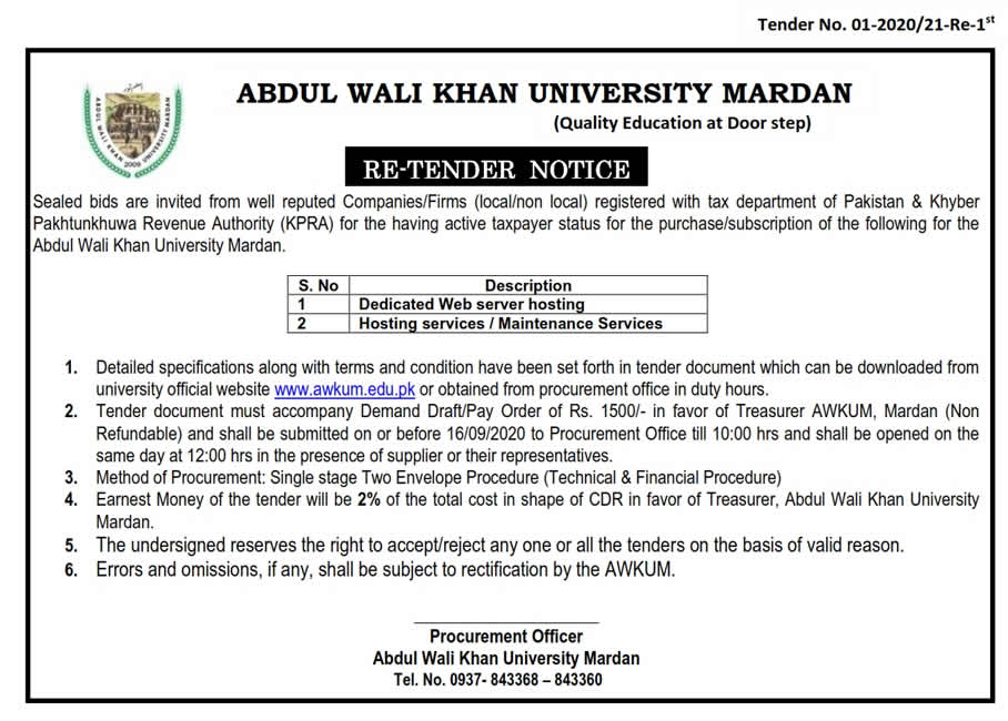 Re-Tender notice regarding Purchase/subscription of Dedicated Web-server/ Hosting Services/ Maintenance Services for AWKUM