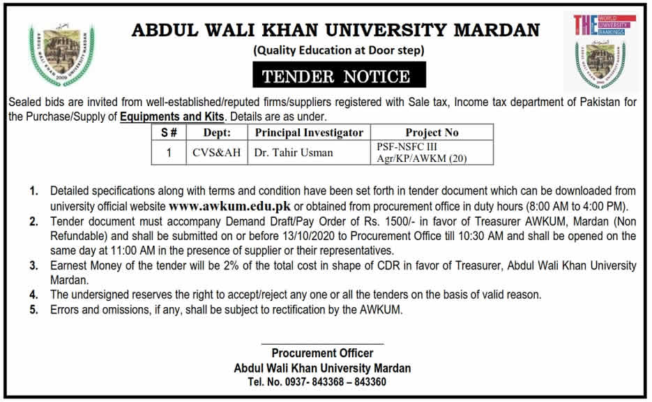 Tender Notice for the Purchase/Supply of Equipments and Kits