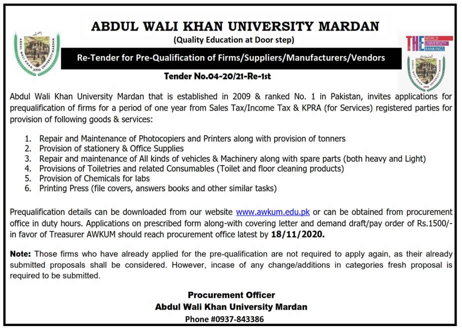 Re-Tender for Pre-Qualification of Firms/Suppliers/Manufacturers/Vendors |