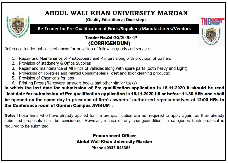 CORRIGENDUM "Re-Tender for Pre-Qualification of Firms/Suppliers/Manufacturers/Vendors" (Dated November 17, 2020)