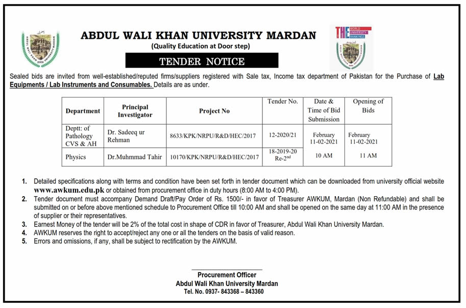 Tenders Notice regarding Lab Equipment/Instruments/consumables