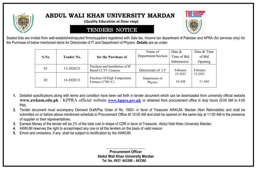 Tender Notice Regarding Purchase of CCTV Cameras & High Temperature Furnace