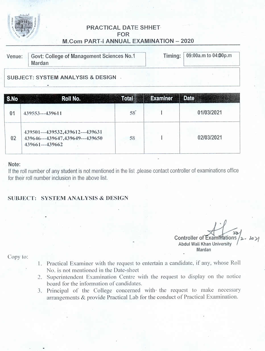 Practical Date Sheet For M.Com Part-I Annual Examination - 2020