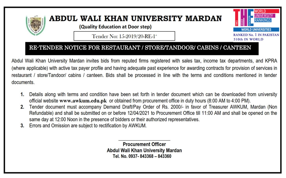 Re-Tender Notice For Restaurant / Store/Tandoor/ Cabins / Canteen