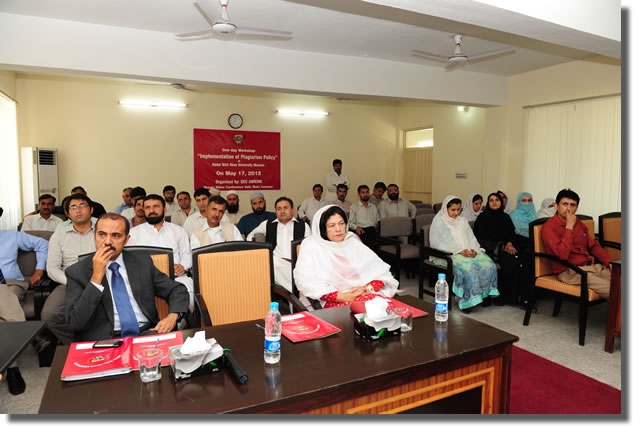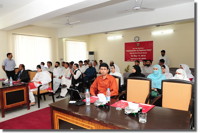 The QEC Abdul Wali Khan University Mardan (AWKUM) organized a one day workshop on “Implementation of Plagiarism Policy at Abdul Wali Khan University Mardan” on May 17, 2012. The Deputy Director QEC AWKUM welcomed the participants. Mr. Shah Husain Awan (DD QEC) and Dr. Zahoor Jan (Focal Person for detecting plagiarism at AWKUM) gave a detailed and comprehensive presentation plagiarism policy on institution level. A detailed session on the use of turnitin took place. The director QEC Dr. Said Khan Khalil who also chaired the session gave a comprehensive address about the policy. He stressed and referred to the functions of QEC including implementation of Plagiarism Policy. He stated that “QEC is responsible for promoting public confidence that the quality and standards of the award of degrees are enhanced and safeguarded”. QEC has to assured the standards of quality through implementation of Plagiarism Policy. With the launch of this policy our research activities will be standardized according to international standards. We will extend this policy to each and every faculty and Inshallah I am confident that a day will come where every assignment will be passed through anti plagiarism software.