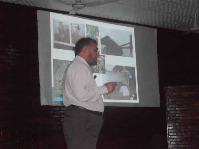 Dr. Ehsan-ul-Haq Senior Scientific Officer (NARC) Islamabad presented a seminar on “Role & Future of Biological Control in Integrated Pest Management (IPM)” at Abdul Wali Khan University Anbar Campus, Swabi. Coordinator Anbar Campus Professor Dr. Mukhtar Alam welcomed the speaker. The speaker shared his experiences for controlling the epidemic pests through biological means. He highlighted the commercial prospects of biological agents in the field of Agriculture and emphasized that insect/pest should be controlled through biological agents instead of insecticide spray. Moreover, he added that by IPM, we cannot only save money but also can protect our environment & public health from residual effects of hazardous pesticides. There was a healthy discussion among the students, faculty members and the guest speaker on various aspects of biological control. At the end the valuable speaker promised that his lab at NARC would provide the facilities, free of cost for practical training of the students of Abdul Wali Khan University Mardan. The speaker also distributed the printed materials about his experiences of “Biological Control of Insect Pests in Pakistan”. He also visited the Agricultural Experimentation Block of Anbar Campus and advised on spot recommendations for the control of insect pests of Maize, Sunflower and vegetables.